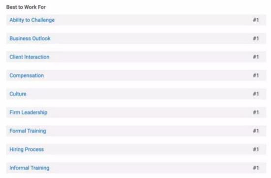 不仅如此,Centerview还横扫Vault细分榜单上几乎所有第一名,包括挑战能力、业务前景、客户互动、薪酬、企业文化、领导能力、正式培训、招聘程序、非正式培训等九个分项都是第一。如下图所示。