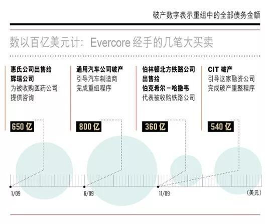 辉瑞公司(Pfizer)收购美国惠氏公司(Wyeth);通用汽车(GM)救援方案;TPG收购IMS Health等为人熟知的数以百亿美元计的deals都是由Evercore经手的。