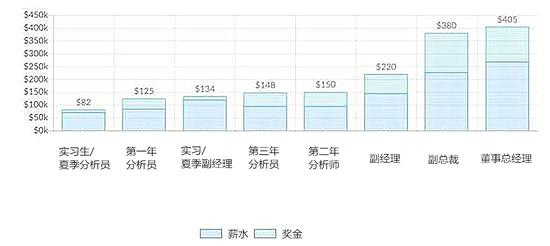 九大投行中第一年分析员的平均薪资为$125000,第三年分析员的平均薪资为$148000,第二年分析员的薪资会有略微的上涨。副经理的平均薪资为$222000。