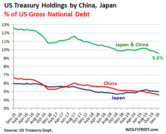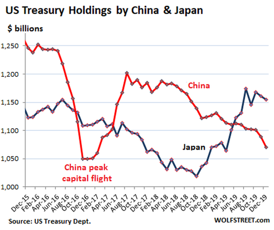 日本去年12月减持了60亿美元美国国债。但在2019年全年,日本增持了1130亿美元,持有的资产增至1.16万亿美元(2014年的峰值为1.24万亿美元)。