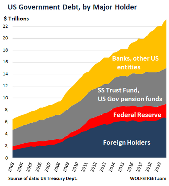 下面的图表显示了美国国债持有者的类别,但“美国商业银行”和“其他美国实体”合并在最上面的类别(黄色)中,共持有35%的份额: