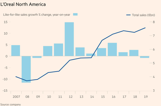 受这些品牌的拖累,去年欧莱雅北美销售额同比下降0.8%,结束了10多年来的连续年增长。与此同时,雅诗兰黛(Estee Lauder) 2月份计入了7.77亿美元的减损支出,原因是其化妆品牌在美国的业绩较差。在截至6月30日的一年里,雅诗兰黛在美国的销售额下降了5%,至47亿美元。