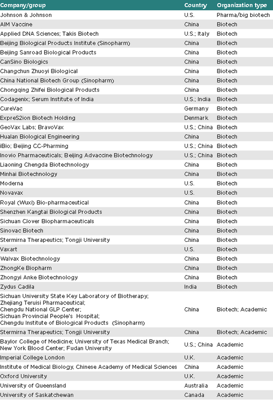 晨哨并购搜集了Biocentury网站上列出38家参与研发疫苗的公司、机构或项目。其中中国占25家。它们不仅为推动疫苗研发做出了贡献,也是企业和投资机构值得考虑的热门赛道标的。