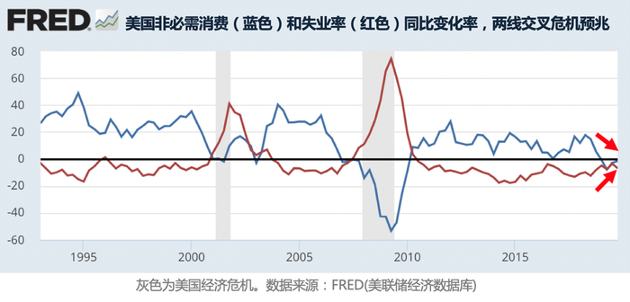 我们在这里截取两组数据来说明需求端的问题:首先,从下图可见,红线上升就说明就业状况恶化,蓝线下降就说明消费恶化。如果仅是消费增长恶化,还有希望通过就业增长来弥补需求,反之亦然。但当两线交叉时,代表就业和消费同时恶化,意味着民众的需求已经难以再突破限制,是经济危机的前兆。2001年和2008年经济危机之前,都出现了两线交叉。而截至上个月的最新数据来看,我们同样观察到了两线交叉。这说明在这次新冠病毒爆发之前,美国经济已经在走向危机。