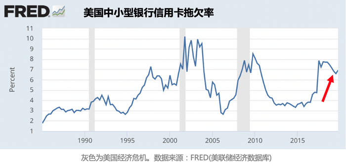 同时,美国信用卡拖欠上升,难以支撑消费增长。民众消费受限制的根源是资本主义体制导致分配不均,工资增长低迷。因此美国老百姓一般靠刷信用卡维持消费增长,如果银行信用卡出现违约率高涨的情况,说明老百姓债务水平负债已经过高,信用卡面临被关停风险,消费增长将受到抑制。下图可见,美国目前的信用卡拖欠率已经达到2001和2008的危机时的水平。1990年危机时,因为信用卡还不那么流行,当时信用卡拖欠率比较低。