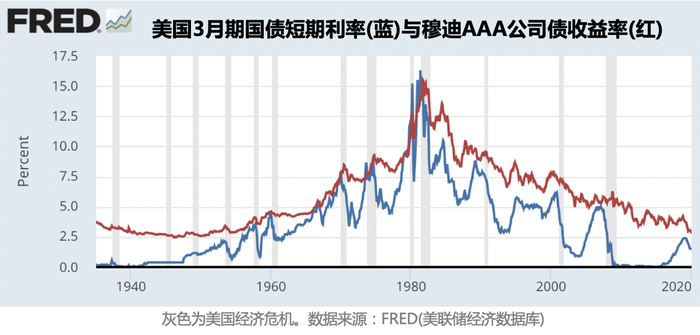 黄郁葱:下图可见,美国短期国债利率在1929年之后的水平几乎是0,直到50年代才涨回到2%左右,比现在还要低,穆迪AAA公司债收益率也和现在十分接近。这意味着1937年美国在零利率时就爆发了经济危机,股市暴跌40%,所以零利率不意味着股市不会下跌。当前股市的走势也反映了这点。