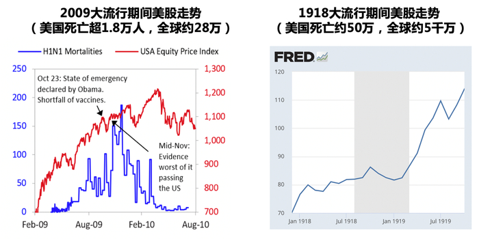 如果美国经济基本面足够健康,即使遭遇“木棒”打击,也难以造成如此严重的市场崩溃。例如2009年H1N1流感病毒在美国爆发期间,美国死亡超过1.8万人,而当时美国经济处于强力复苏阶段,股市(红线)几乎是随着死亡人数的上升(蓝线)而大涨;1918年的全球流感造成全球死亡高达约5000万人(相当于现在的1.5亿),美国死亡也高达约50万人(相当于现在的150多万人),美国道指(.DJI)也没有出现暴跌,仅是平稳之下略有波动。