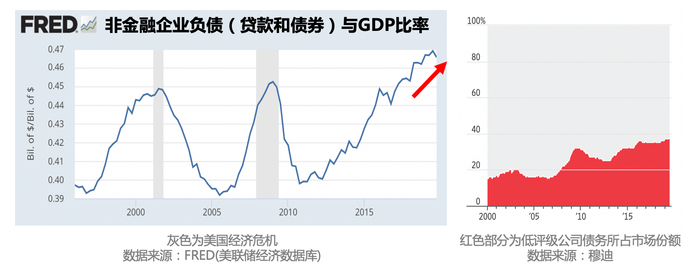另一方面,美国公司债的规模和质量都比2008年“次贷危机”还要恶化。如下图所示,美国非金融企业债占GDP的比例由2008年危机前的69%上升到74%,而低质量贷款的占比由2008年的不到20%上升到近40%。这将引起严重的债务危机。