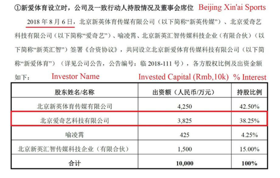 “2018年8月6日,北京新英体育传媒有限公司(以下简称“新英传媒”)、北京爱奇艺科技有限公司(以下简称“爱奇艺”)、喻凌霄、北京新英汇智传媒科技企业(有限合伙)(以下简称“新英汇智”)签署《合资协议》,共同设立北京新爱体育传媒科技有限公司(以下简称“新爱体育”)(详见公司公告,公告编号:临2018-111号),各方股权比例及出资金额如下”