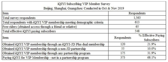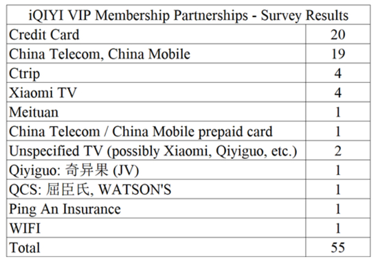 爱奇艺的管理层没有提供关于这些会员的数量、通过这些合作关系带来的会员总数的百分比或爱奇艺在这些合作关系中的实际收入份额的数据。爱奇艺的投资关系代表告诉投资者,与京东的收入分成是50/50,但没有透露与其他合作伙伴交易的情况。爱奇艺的投资者关系代表还否认了从京东获得公司VIP内容的客户和其他每一个合作关系对公司收入/ARPU的影响。