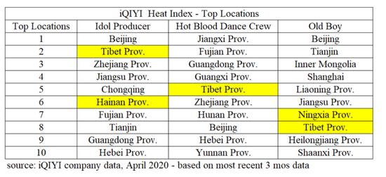 然而,我们最近对《老男孩》、《偶像练习生》和《热血街舞团》等爱奇艺热门节目进行审查时发现,西藏、海南、宁夏或内蒙古等人口稀少的地区都进入了收视率前十名。