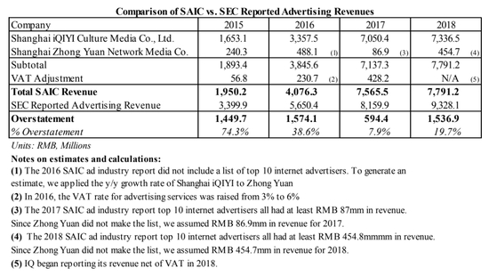 我们根据上海市政府2015年至2018年发布的对广告公司的排名(按收入排名)得出结论,爱奇艺在2015年至2018年期间累计预估的广告收入多报了51.55亿元人民币。“