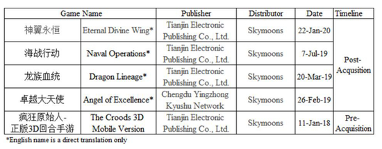 我们对中国版权记录的审查发现,自2018年7月被收购以来,天象互动尚未注册任何新的出版物版权。相反,我们在其名下仅找到4款游戏的发行权,且都是从其他游戏公司处获得授权: