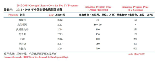 据中国媒体报道,从2016年到2018年,各大网络平台对热门内容的竞争愈演愈烈。这导致一些在线播放许可证的售价是电视台的两倍,尤其是流行的“古装奇幻类”。然而,爱奇艺所支付的额外费用似乎仍然过高。中信证券的一份报告提供了2012年至2018年版权成本最高的一个表格。从2012年到2018年,网络和电视转播商的”大制作“许可费每年都在增长,直到2017年网络和电视的溢价率达到1.88倍的峰值。然而,价格在2018年出现了逆转,溢价下降了20%至1.5倍。