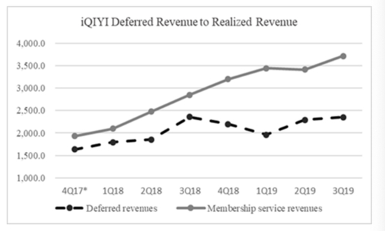 爱奇艺报告的递延收入严重虚报,这进一步表明其夸大收入。递延收入是资产负债表中的一个账户,里面包含的是客户已预付的将在未来交付的服务。因为大多数爱奇艺的客户都是预付费的,因此可以将爱奇艺的收入看作是递延收入。