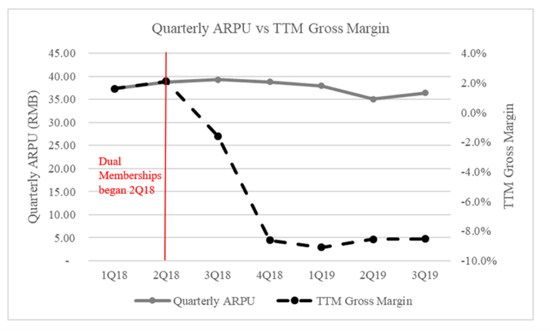 如果我们将爱奇艺的ARPU值与上市以来的毛利率进行对比,就能充分看出爱奇艺对这些双重会员计划的利用程度。因为爱奇艺的ARPU值是按毛利计算的,所以它的ARPU值一直相对稳定,而毛利率却大幅下降。