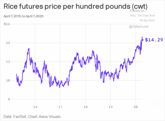 国际大米期货价格近来持续上涨 新浪财经综合 2020.04.1016:53 关注 随着一些国家设立了粮食出口禁令,同时各国民众在疫情期间广泛囤积大米,国际大米期货价格近来持续上涨。(图:Axios) 来源:智堡