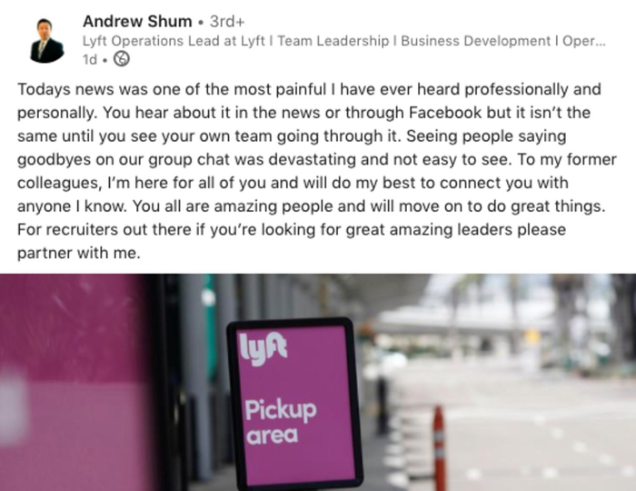 “人们从Facebook上知道裁员的消息,但这和你亲身经历自己的团队有人离开的感受完全不同。今天很多被裁员的人在团队的群聊组里和大家道别,对每个人来说都太难受了。”Lyft的Operation Lead Andrew Shum在LinkedIn这样写道。