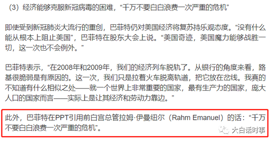 作为美国最重要的投资者,巴菲特没办法躲开这场危机,也不能躲开这场危机,因为他是美国很多投资者的精神图腾和表率。