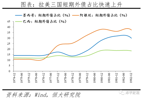外债规模持续扩大,短债占比快速攀升,拉高债务风险。从总量看,70年代拉美各国外债规模急剧膨胀,外债余额占GDP比例持续爬升。1970年墨西哥、阿根廷和巴西三国的平均外债余额为63亿美元,而1980年平均外债余额已猛增至523亿美元,增幅高达727%。从结构看,危机爆发前拉美国家短期外债占整体外债比重快速攀升,1977-1980年,墨西哥、阿根廷和巴西三国平均短债占比由18%迅速上升至28%。债务结构的不合理进一步加重拉美国家的债务负担、拉高债务风险。