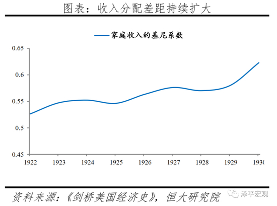经济结构不平衡,收入分配差距持续拉大,生产过剩与需求不足的矛盾日益加深。20世纪20年代,伴随战后经济重建,美国经济进入高速发展期,1921-1929年美国GDP年均增速达4%,工业生产指数上涨幅度达67%,史称“柯立芝繁荣”。但繁荣的背后,结构性问题持续累积,生产过剩与需求不足的矛盾日益加深。其一,经济结构不平衡。以汽车、电气、建筑为首的制造业快速发展,但农业进入漫长萧条期,大量农场破产,农民收入远低于全国平均收入水平。其二,收入分配差距持续扩大。20世纪20年代末,美国最富有的前10%家庭收入占总收入比重上升至近50%的高位水平,家庭收入基尼系数由1922年的0.53增加至1930年的0.62。