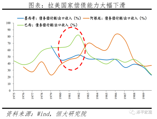 美元升值、全球大宗商品价格下跌,拉美国家出口减少,利息负担上升,偿债能力大幅下滑。从收入来看,美联储加息引发美元持续升值,以美元计价的全球大宗商品价格下跌,1980至1982年末CRB期货价格指数跌幅超过30%。拉美国家出口收入锐减,偿债基础被破坏。从支出来看,国际金融市场借贷利率的上升使拉美国家借贷成本攀升,利息支出快速增加。双重压力下,拉美国家偿债能力大幅下滑,以墨西哥、阿根廷和巴西三国为例,1980-1982年,三国债务清偿额占出口收入比重均值由50%上升至62%。
