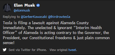他早些时候在推特上发文,特斯拉正以“(该县)与州长、总统、我们的宪法自由和简单的常识背道而驰!”为由对阿拉米达县提起诉讼。