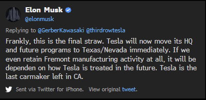 韦德布什证券(Wedbush Securities)分析师丹•艾夫斯(Dan Ives)在电话中表示:“从马斯克和特斯拉的角度来看,部分原因是他们感到沮丧,因为他们基本上是在弗里蒙特附近扎根的,当地是他们业务的核心所在。”