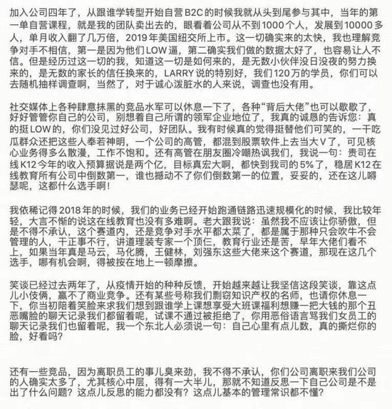 “加入公司四年了从跟谁学转型开始自营B2C的时候我就从头到尾参与其中当年的第一单自营课程,就是我的团队卖出去的眼看着公司从不到1000个人发展到10000多人单月收入翻了几万倍2019年美国纽交所上市。这一切确实来的太快我也理解竞争对手不相信,第一是因为他们LOW逼,第二确实我们做的数据太好了也容易让人不信。但是经历过这一切的,我知道这一切是如何来的,是无数小伙伴没日没夜的努力换来的,是无数的家长的信任换来的LARRY(新浪财经注:跟谁学CEO陈向东)说的特别好我们120万的学员你们可以去随机抽样调查啊,当然了,对于诚心泼脏水的人来说,调查也没有用。