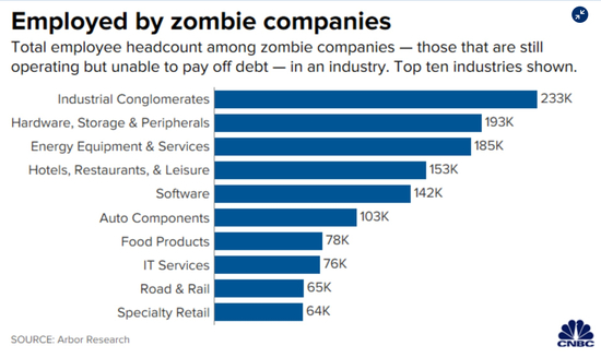 “僵尸企业”指的是需要不断救助才能维持营业的公司,或者是负债累累、仅能够偿还债务利息的公司。“僵尸化”一直在侵蚀日本经济,如今正逐渐影响到美国经济。更糟糕的是,根据Arbor Data Science的最新数据,美国“僵尸企业”雇佣了大约200万人。