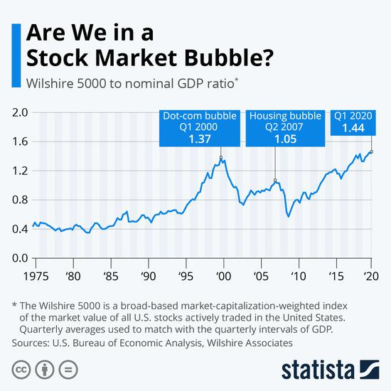 尽管美联储主席鲍威尔在6月记者会上不断强调“不会放弃支持经济”,但事实上他们的资产购买量也已经降到了近期最低的水平,国会正在讨论的下一笔救济方案据悉也比之前大大缩水。巴菲特最青睐的指标——Wilshire 5000指数衡量的市场市值与美国GDP的比率当前甚至比互联网泡沫破灭前夕的比率还要高。