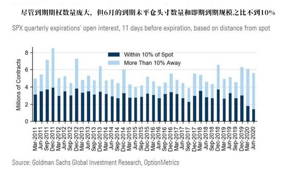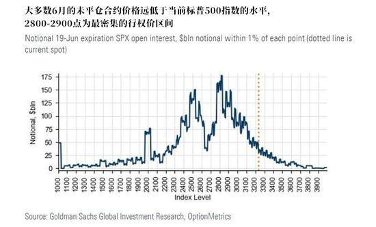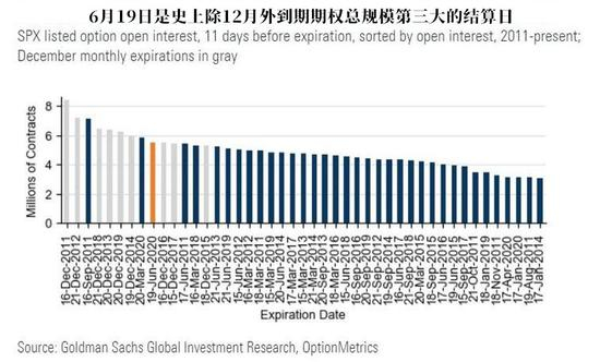 至于另外一点,高盛数据显示,6月19日将有1.8万亿美元的标普500指数(SPX)期权到期,这是有记录以来期权到期规模第三大的、非12月的季末结算日(通常12月到期规模也比较大)。