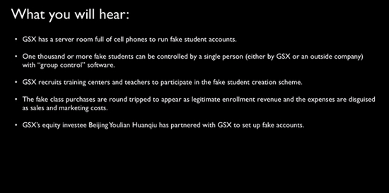 浑水表示,这段视频的内容主要包括了浑水对一位跟谁学前经理的采访录音。录音中,这位受访者谈到了前雇主(指的即是跟谁学公司)是如何通过群控的方式——一个人同时控制上千台手机设备,每台手机有自己的独立的微信号或手机号,能够在公司所指定的时间去买课和听课,一个月刷的用户量可达到30万至200万不等。