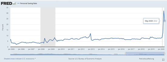 今年4月,美国个人储蓄率跃升至32.2%。在今年新冠疫情爆发之前,这一数字从未超过17.3%,自1995年以来只有一次突破10%。美国商务部上周五公布的最新月度数据显示,虽然有了明显的降幅,但5月份美国储蓄率降至仍处于高位的23.2%。