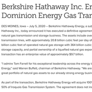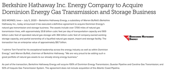 巴菲特终于打破了许久沉默,进行了四年多来规模最大的一笔收购,而这笔交易似乎也是巴菲特认可和瞄准已久的。他在声明中表示:“我钦佩法雷尔(道明尼能源CEO)在能源行业以及道明尼能源的卓越领导能力。我们非常自豪能在本已强大的能源业务中增加如此巨大的天然气资产组合。”