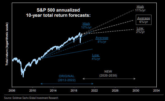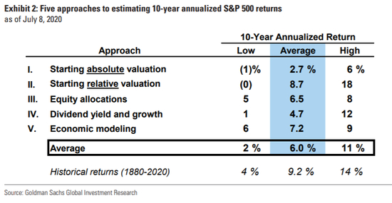 高盛曾在2012年7月进行了类似的预测,其当时预计美股未来10年内年化收益率将达到8%,幅度在4%-12%之间,而此后8年以来,标普500指数实际年化收益率为13.6%。