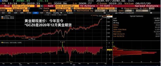 另一种常被忽略的解释是贴水反映了投资者对负利率进一步加深的恐惧。虽然黄金没有任何收入,但若保留现金意味着还要支出利息,黄金相对而言是有正收益的资产。七月中旬以来,伴随黄金的疯狂上涨,黄金升水也迅速收窄,甚至一度逼近于0。如果从实际利率的角度解释近段时间期现差价收窄,也符合本轮金价上涨的叙事基础。