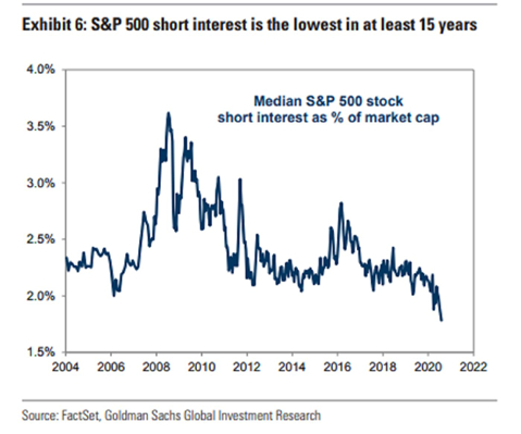 高盛的数据显示,在八月初,标准普尔500指数的平均空头利息仅占市值的1.8%,这是自2004年以来的最低水平。除能源以外的所有主要板块的看空头寸都在过去15年来的最低位。