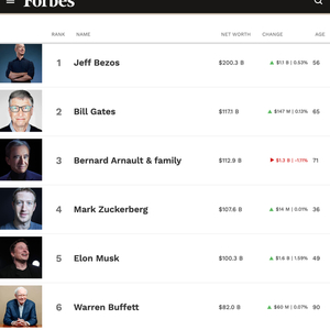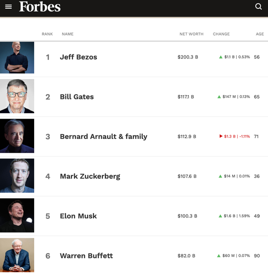 目前,《福布斯》实时亿万富翁榜单排名前六位的分别是亚马逊CEO贝佐斯、比尔-盖茨(Bill Gates)、LVMH集团董事长Bernard Arnault及家族、Facebook CEO马克-扎克伯格(Mark Elliot Zuckerberg)、马斯克和股神沃伦-巴菲特(Warren Buffett) 。