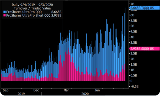 当下散户在美股市场中的角色也决定了市场走势可能将以极快的速度切换。例如在本轮调整中,9月4日Robinhood的大批投资者就涌入购买三倍杠杆看空的SQQQ,情绪迅速转换。这种“见风使舵”的投机风格将在市场上涨时推波助澜,但在市场下跌中也将扩大恐慌,加速市场暴跌的速度与规模。