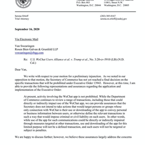 在美国总统特朗普8月初颁布行政命令封杀微信之后,美国华人自发组成了非盈利机构美国微信用户联合会(以下简称:美微联会),计划通过起诉美国政府来维护美国500多万华人继续使用微信的权利。8月21日,美微联会在加州北区联邦法院正式起诉总统特朗普和商务部长罗斯,8月28日,美微联会提交了禁止令申请动议,认为微信禁令侵犯了美国华人的言论自由,对华人构成了歧视,要求联邦法官下达初步禁令,否决总统关于微信的行政命令。