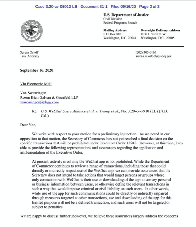 8月28日,美微联会提交了禁止令申请动议。9月8日,美国司法部也提交了针对美微联会诉讼的抗辩文件。9月11日,美微联会将针对美国司法部的抗辩提交回复文件。加州北区联邦地区法院将于9月17日上午召开听证会,并于9月20日宣布是否决定暂时否决总统的微信禁止令。