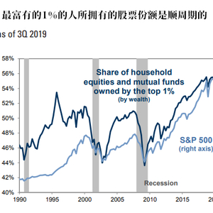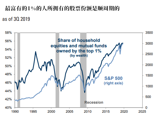 下面这张图显示,那前1%的富人所持有的股票份额是顺周期的,也就是说,当市场开始陷入衰退时,他们往往就会开始大量抛售手中的股票。