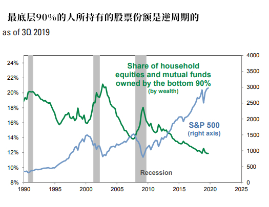 从下面这张图中可以看到,最底层的90%的散户所持有的股票份额在衰退开始时反而出现了增长。