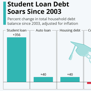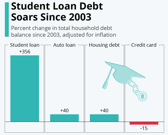 纽约联储消费者信贷小组的数据显示,在过去17年中,美国学生贷款债务激增了350%,这几乎是汽车贷款和抵押债务40%增速的10倍。而自2003年以来,信用卡债务则小幅减少了15%。