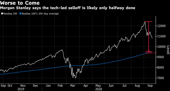 这位策略师认为,以科技股为主的这个指数可能跌向200日均线。该均线目前接近9528点,较当前水平低12%,较本月初创下的历史新高12421点低23%。