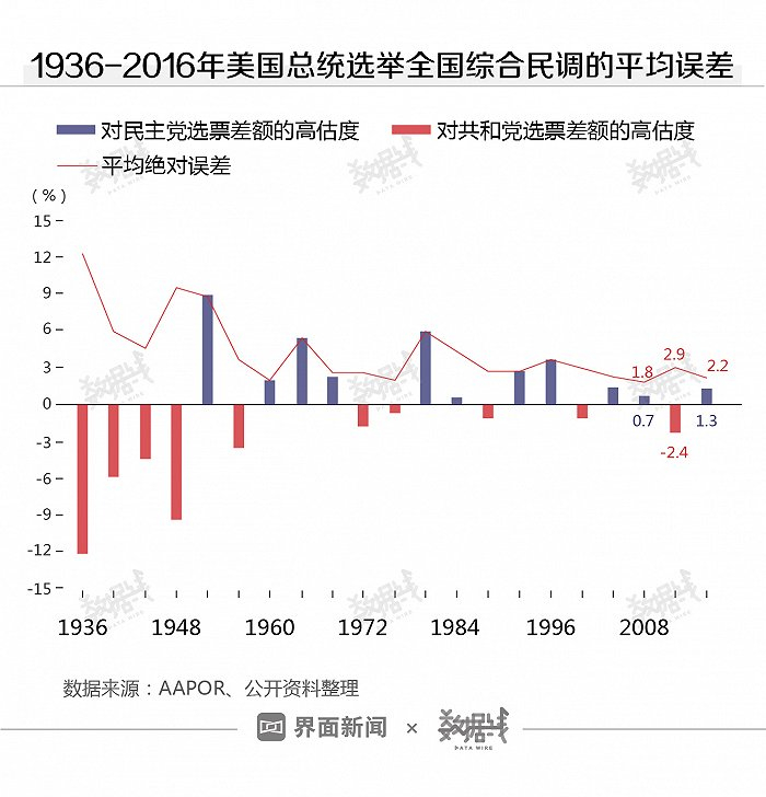 和历史平均水平相比,2016年的误差不到1936年以来全国综合民调数据平均误差的一半(4.4%),也低于1992年以来的平均误差(2.7%)。