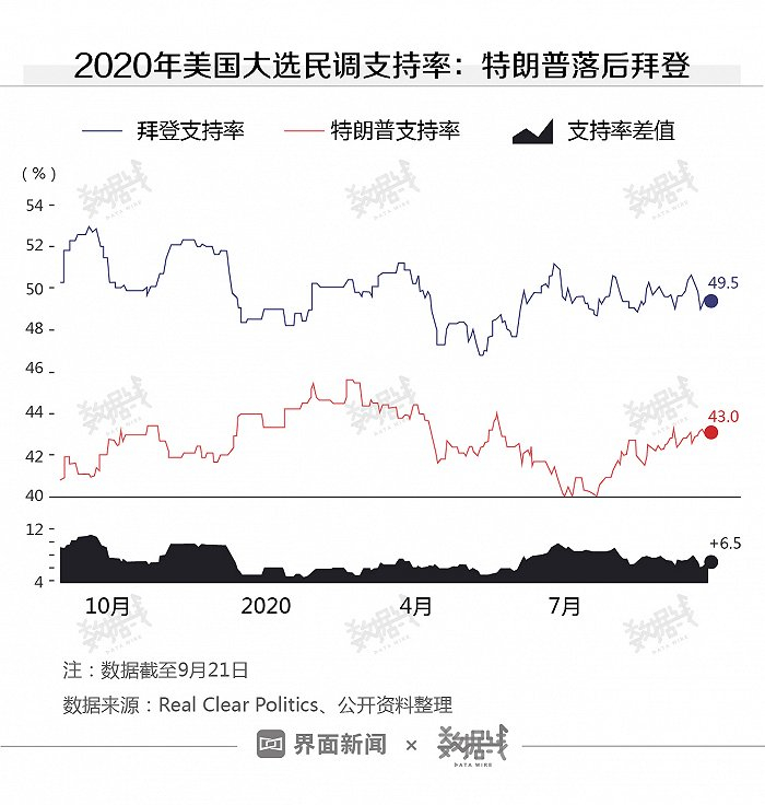 据Real Clear Politics最新的全国综合民调数据,目前特朗普的支持率落后于民主党候选人拜登。截至9月21日,特朗普支持率为43%,落后拜登6.5个百分点。