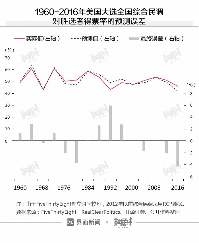 回溯历史,全国综合民调的预测准确度比较高,并且准确度还在不断提升。从历届大选的投票结果来看,综合民调对胜选者和败选者最终得票率的预测误差,基本控制在4个百分点之内。