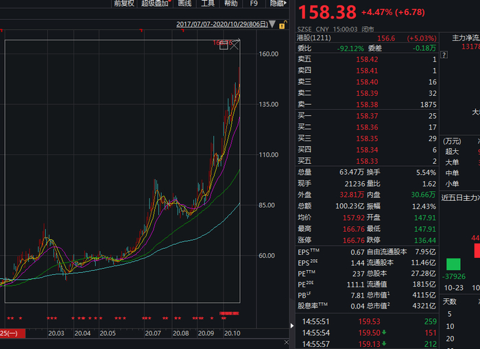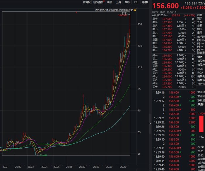他的股价表现有多疯狂?继市值突破4000亿大关后,29日比亚迪股价再创新高,盘中一度触及涨停,最终报收158.38元,涨幅4.47%,年内以来,比亚迪累计涨幅已达232.66%,最新市值4321亿元。